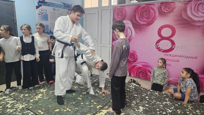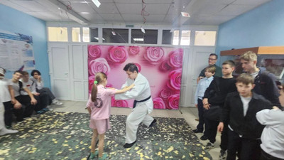 Вчера, 4 Марта, в преддверии 8 Марта, в празднично украшенном фойе Домодедовской гимназии № 5 ученик 11В класса, спортсмен нашего Клуба Айкидо «Дзаншин-кай» Домодедово - Бяширов Владимир провёл мастер-класс для представительниц прекрасного пола гимназии и показал им некоторые приёмы самообороны.